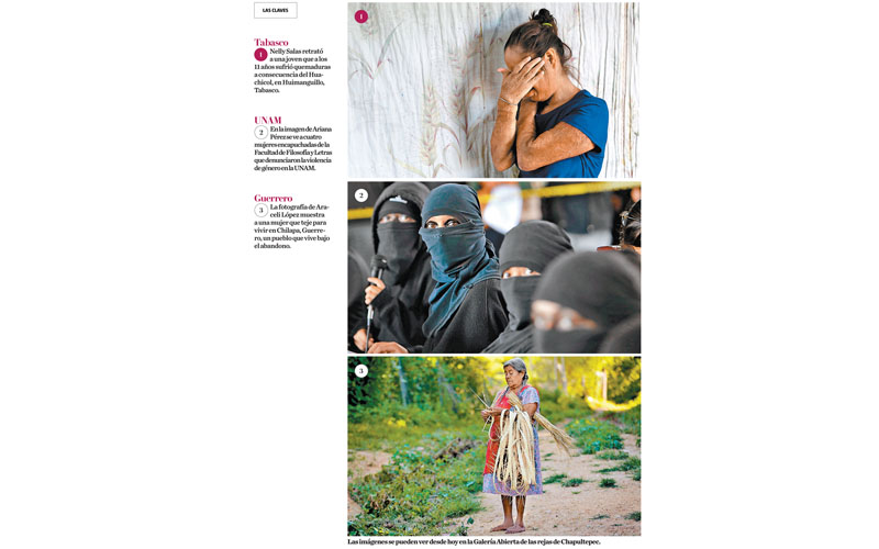 Su profesionalismo y la manera de ofrecer su visión en las páginas del periódico y la página web de MILENIO les valió para ser seleccionadas y mostrar sus fotografías en la Galería Abierta de las rejas de Chapultepec, dentro de la exposición Encuadres y miradas; desde nosotras, que se inaugura hoy, a las 12 horas, en la Bahía Acuario del Bosque de Chapultepec.