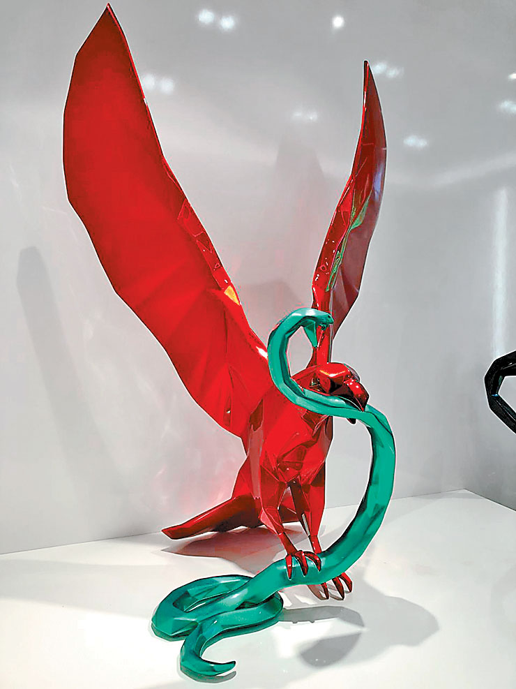 La galerista dice que la escultura evoca la “leyenda de la capital de México, construida en el mismo lugar donde los aztecas localizaron en 1345 un águila parada sobre un nopal devorando una serpiente. Orlinski esculpe un águila en color rojo, en alusión a la sangre de los héroes, y en el pico le coloca una serpiente diseñada en un verde luminoso, como símbolo de la esperanza”.