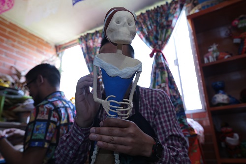 “Al principio era ensayo y error, probar con los colores, perfeccionar la técnicas y experimentar con los materiales con los que hacemos la estructura de la pieza, con el tiempo se fue haciendo más fácil: le pegamos el papel periódico con engrudo para darle forma, después modelamos en plastilina y le ponemos unas 4 capas de papel con engrudo, una vez ahí se pinta”.