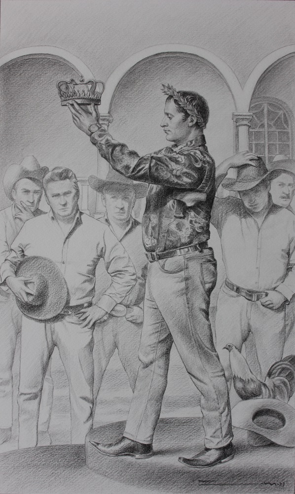 “Sin talento no busques grandeza/ Porque nunca la vas a tener”. Ser el jefe de jefes en el arte es resultado del talento. Carlos es de Durango, nos habla del proceso de este dibujo: “Fue apasionante tomar esta canción que es muy popular en estas tierras y reinterpretarla. Hice una apropiación de una gran obra maestra, que es la Coronación de Napoleón de Jacques-Louis David, que se encuentra en el Museo de Louvre. Intenté hacer una metáfora para ilustrar esta idea, de cuando alguien se siente en ese nivel. En la pintura original aparece Napoleón, tomando su corona. En vez de ser coronado por el Papa, en aquel entonces Pío VII, él mismo se corona. Con esa acción, él se está autoproclamando el emperador del mundo conocido, pues es el jefe de jefes. La referencia que está atrás de él es una paráfrasis de todos los elementos que se ven en el gran cuadro del Museo de Louvre, pero ahora con personajes de nuestra cultura popular, de nuestro folclor del norte. Hay elementos que hacen referencia de aspectos tanto del Jefe de jefes como de la Historia del Arte”.