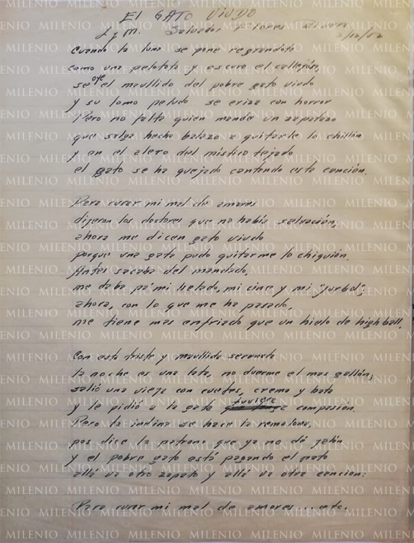 Manuscrito original del tema "Gato Viudo", de Chava Flores, de 1952 (Crédito: Archivo personal María Eugenia Flores Durand).
