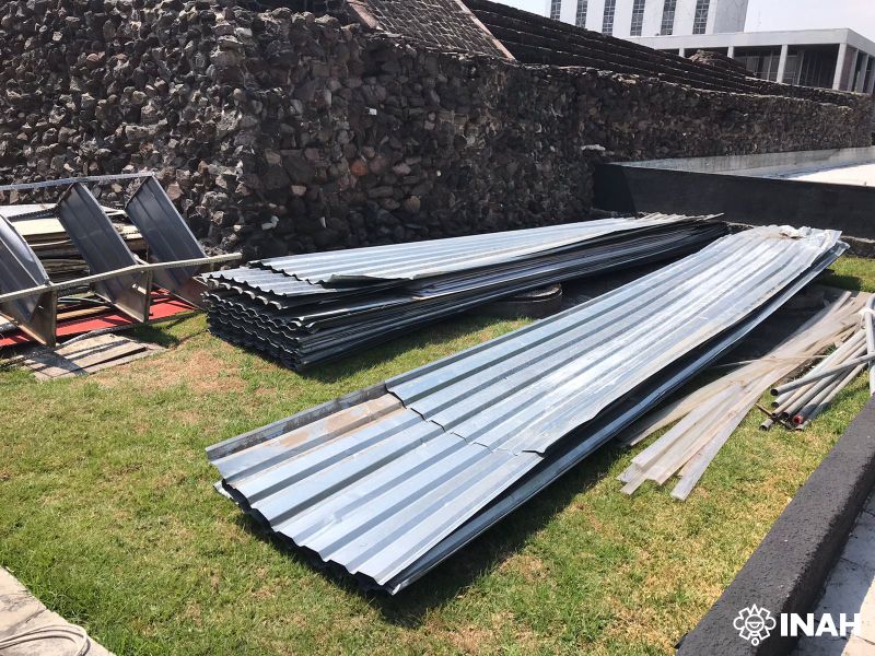 La noche del pasado 27 de abril, debido a las fuertes lluvias, particularmente a consecuencia de una tromba, la cubierta temporal en el sitio prehispánico se vino abajo.
