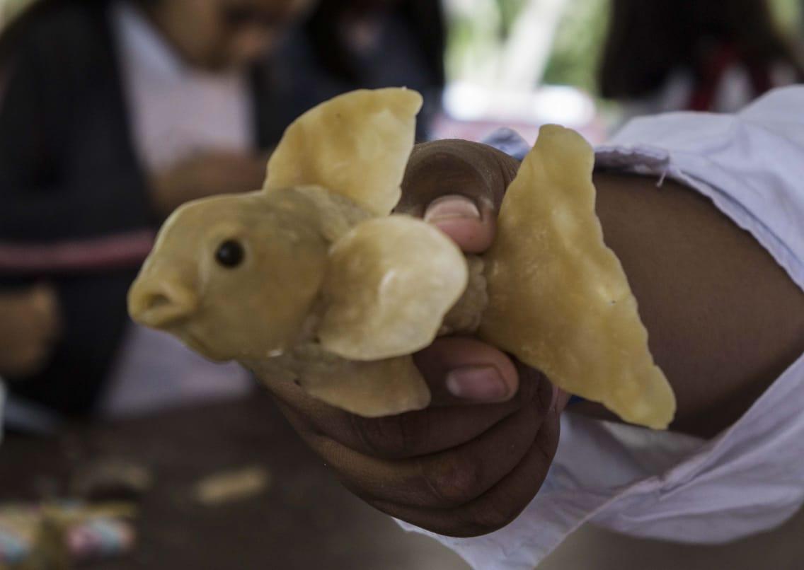 El tallerista Jesús Emanuel Vega Domingo proviene de Sabanas de Xolostoc, Coxquihui, Veracruz y es uno de los guías en la creación de figuras de cera. Cuenta: “Para este taller, trabajamos con materiales naturales como lo es la semilla de zapote mamey, semilla de hoja de papatla y el coyol. Podemos hacer figuras básicas como son colibrís, caballos, peces, patos o cisnes, pero el visitante puede hacer lo que guste”.