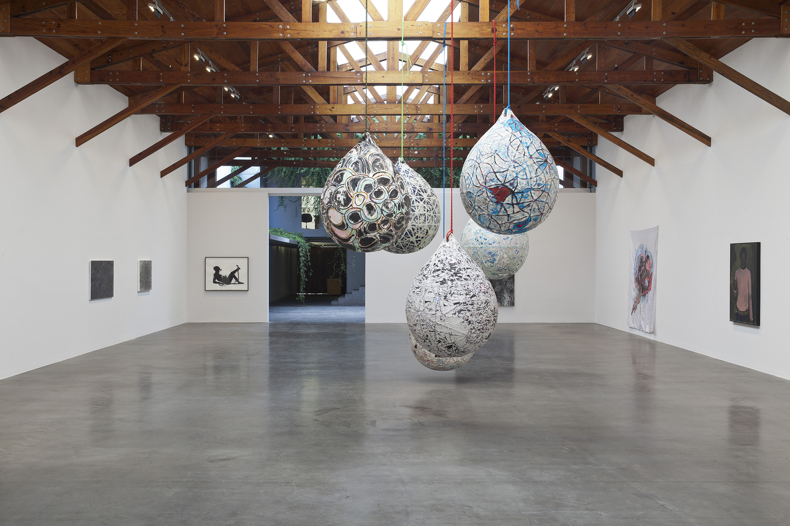 La pieza de mayor dimensión en la sala consta de un conjunto de seis boyas gigantes creadas por Mark Bradford (Los Ángeles,1961), uno de los artistas más celebrados de la actualidad por sus enormes y sensoriales collages, que evocan los problemas del racismo y la pobreza en la actualidad, así como el romanticismo de la guerra civil.