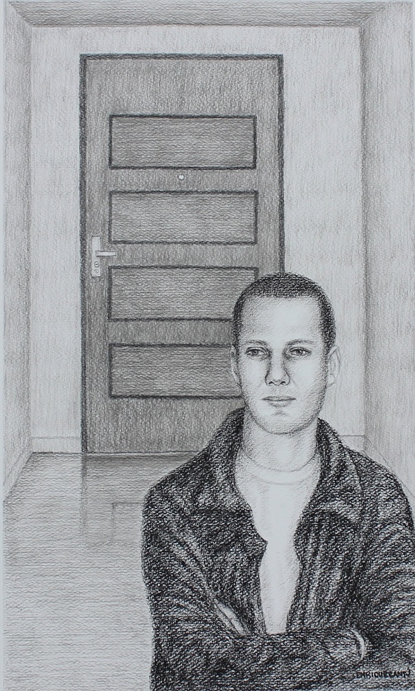 Ese espacio vació, ese trayecto, lo hizo la persona que lo abandonó. Es un trayecto larguísimo, nos cuenta Enrique: “Enorme. No me cabía en el dibujo, pero traté de hacerlo, como dice la canción, “todo lo que vivimos y la felicidad que tuvimos nos vino a traer dolor”. Quien se va renuncia a todo aquello bello y grato que tuvieron, que compartieron, y decide irse. Decide marcharse y no regresar jamás. Entonces simplemente la puerta está, pero el escuchar cerrar la puerta es algo muy fuerte. El personaje tiene los brazos cruzados, la mirada no la tiene perdida, pero sí la tiene en la esperanza. Su mirada, para mí, representa esperanza. Esperanza de escuchar que se abre la puerta allá atrás y que regresa su ser querido. Esas esperas son horribles y eternas”.