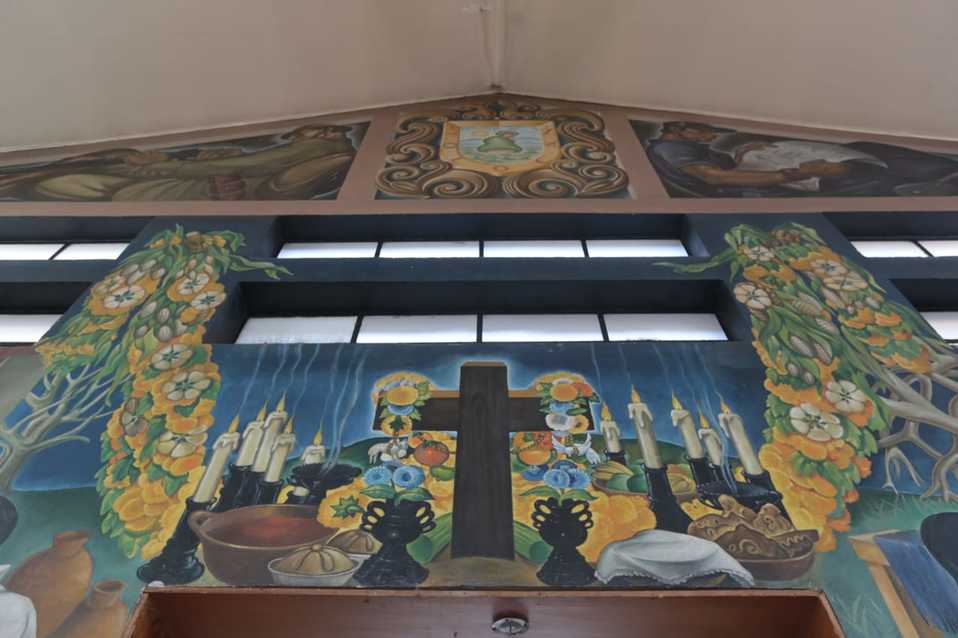 En el primer mural, dijo, se observa el Xinantecatl, la alimentación típica, la fusión de tradiciones religiosas, la llegada de españoles, en el segundo la danza de moros y cristianos, así como la de los concheros que aún se realizan en las comunidades y en el último se observan a los artesanos de barro negro y rojo, ofrendas tradicionales, el telar de cintura y el escudo de la capital mexiquense.