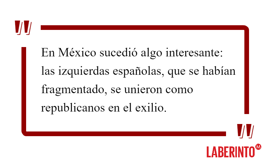 De 22 mil a 30 mil españoles llegaron a México, una nutrida inmigración, donde el gobierno les procuró una nueva nacionalidad y con ello empleos y una vida recobrada: la de la paz. Muchos de los recién llegados eran intelectuales, surgidos de los aires renovadores que alimentaron a la República y que quisieron trabajar por una España moderna y menos influida por la Iglesia. Muchos jóvenes de aquella República habían estudiado en el Instituto Libre de Enseñanza, gran proyecto pedagógico. Venían escritores, filósofos, juristas, médicos, también profesores de escuela inoculados de ideales socialistas que pensaban que los cambios debían partir de la educación temprana. Actores y actrices, pintores, obreros calificados y sumamente politizados, campesinos que avalaban las propuestas republicanas para crear una sociedad más justa, más igualitaria. Sin duda, esta diáspora enriqueció a México. Y aquí, en México, sucedió algo interesante. Las izquierdas españolas, que se habían fragmentado, se unieron como republicanos en el exilio.