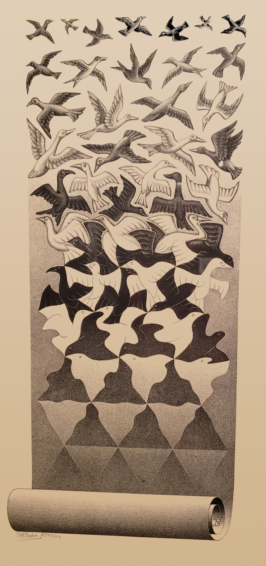 No eran matemáticos y obsesionaron a los matemáticos. El arte en su estado más puro de perfección seduce a la ciencia. Escher confinó al infinito en el gabinete de su estudio, en ese pequeño mueble guardó secuencias interminables, demostrando que la realidad es una ilusión de nuestros sentidos. La abstracción de las matemáticas en una abstracción estética, organizada y sensorial, el cálculo se transmutó en intuición, la observación en obsesión.