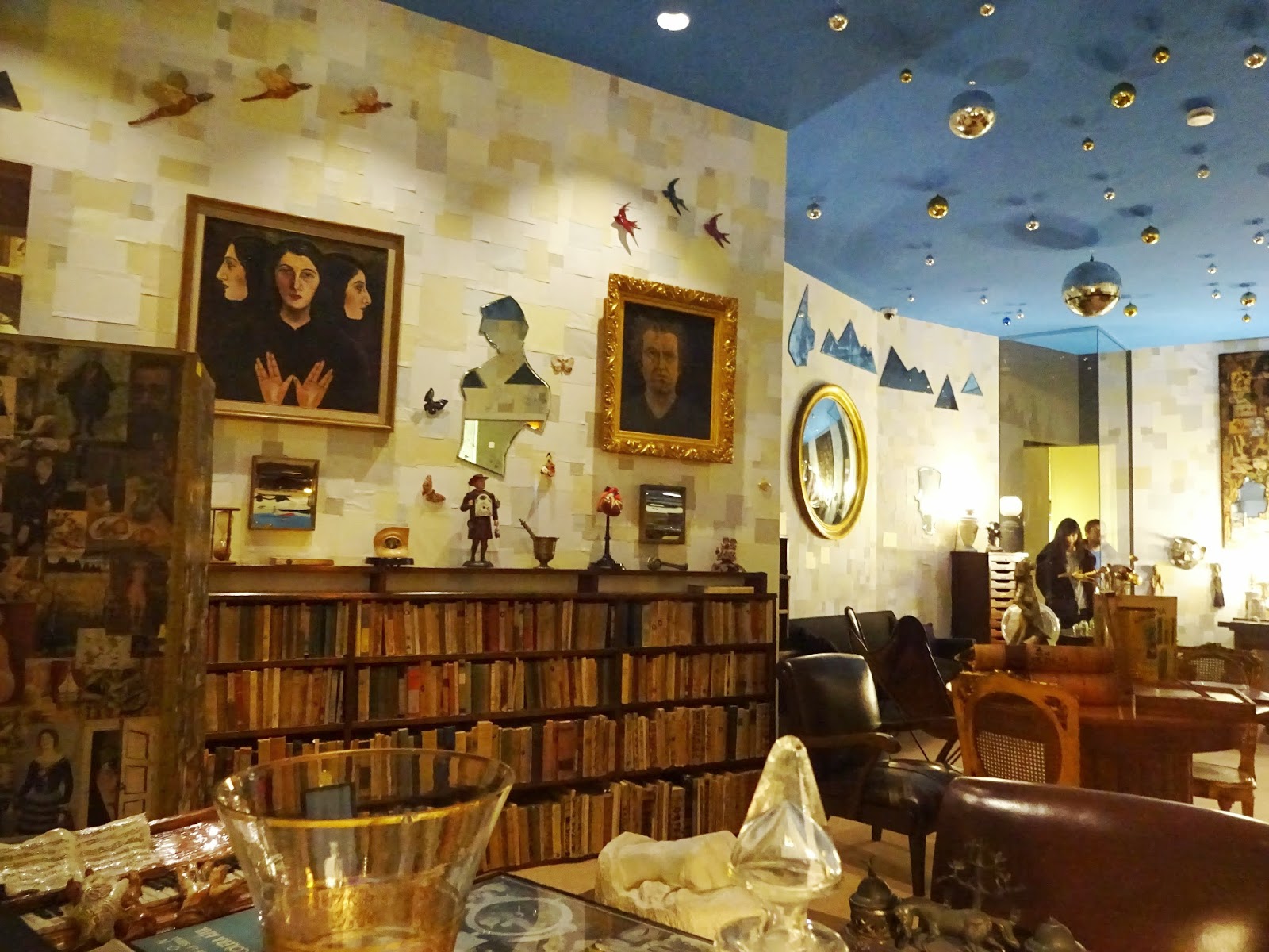 Aquí la vista se satura al instante. En pocos metros cuadrados (y cursis) cabe “lo transitorio, lo fugitivo y lo contingente” (Charles Baudelaire dixit), lo costumbrista y lo cosmopolita, lo casual y lo premeditado. Hay, entre otras cosas, tres biombos convertidos por el procedimiento del collage y el fotomontaje en “estamparios”, jarrones llenos de canicas, un zoológico kitsch (una tortuga disecada, un sapo gigante, un leopardo, dos gatos negros, un conejo, dos pájaros, dos patos, ocho mariposas, seis golondrinas de cerámica), una calavera tallada en hueso, dos ángeles de madera, el busto de una mujer que se utilizaba para exponer joyas, un retrato de su esposa con tres cabezas, tres espejos cubistas, un par de máscaras africanas, una colección de pipas, un escritorio repleto de pisapapeles, un estante con sus obras completas (y todas sus traducciones) protegido con el cartel de “Peligro de muerte” (“por si alguien quiere llevarse mis libros”)… y el techo azul convertido en un cielo artificial con varias bolas de cristal plateadas y doradas, como si fuesen estrellas o planetas lejanos, en las que se reflejan las cosas de manera distorsionada y burlesca. Aquí, no lo duden, todo es prolífico, excesivo, hondo, casi mágico. Solo falta que en cualquier momento aparezca Ramón.