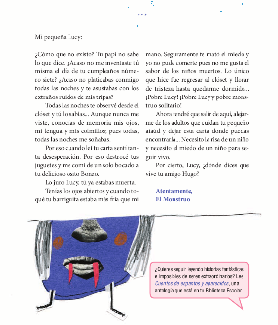Es una narración epistolar conformada por dos cartas: en la primera, Lucy se despide del monstruo que la ha aterrado durante mucho tiempo. Le explica que ya no le teme más, porque su padre le ha asegurado que no existe.En la segunda carta —con una mezcla de ira y tristeza—, el monstruo reclama que Lucy lo haya olvidado, pues su propia existencia depende de un niño que piense en él.