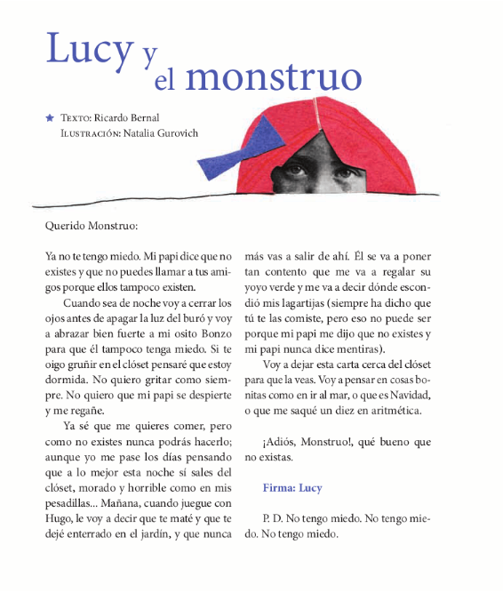 “Escribí 'Lucy y el monstruo' en 1990. No fue pensado como cuento infantil; de hecho se trató de una tarea para la Escuela de Escritores de SOGEM, donde la maestra Aline Pettersson nos encargó escribir un cuento epistolar”.“En 2014 —agrega—, algunos profesores de la Escuela Mexicana de Escritores fueron invitados por la SEP a formar parte del comité de selección para los libros de texto: se decidió incluir “Lucy y el monstruo” en el libro Español, lecturas de quinto. Se hizo un contrato y cuando me preguntaron por mis honorarios, mi respuesta fue: cero pesos, pues me pareció justo regalar ese cuento a los niños de México.