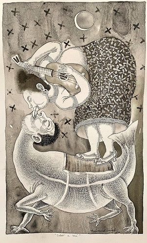 “Yo no sé si tenga amor la eternidad”. El tiempo sin el ser amado es eterno e insoportable. Maximino Javier dibuja un “beso” para la canción Sabor a mí, del maestro Álvaro Carrillo. Es una fábula entre un hombre reptil y una amazona, un amor lúdico, natural, mitológico, un beso eterno.