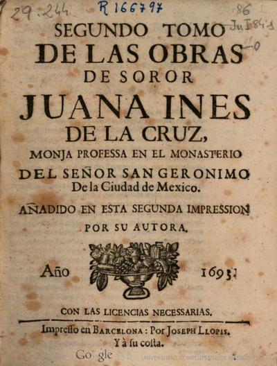 López-Portillo Romano detalló las publicaciones por orden cronológico, comenzando por el título Segundo tomo de las obras de soror Juana Inés de la Cruz, monja professa en el Monasterio del señor San Gerónimo de la Ciudad de México, fue publicado en 1693 en la ciudad de Barcelona por Joseph Llopis y a su propia costa.