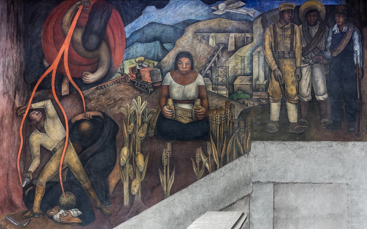 Rivera regresa en 1941 de Estados Unidos, donde sembró alegorías marxistas sobre el trabajo redentor que dignifica al hombre y producirá un Estado emancipador. Allá consolidó su fama de muralista, gracias en parte a la estancia moscovita de 1927-28 que lo sensibilizó al trotskismo y lo abasteció de fuentes visuales con trasfondo de utopía proletaria e industrializadora. En México, la ideología socialista de la posrevolución y la prioridad política de convertir la educación y la cultura en agentes de transformación, a nivel de calle y a escala federal, cedieron el paso al fomento al auge económico, el turismo y la inversión extranjera.