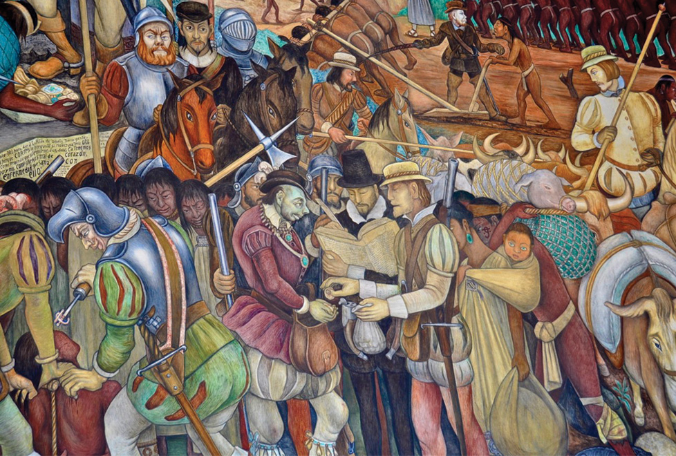 El fresco La gran Tenochtitlan exalta al tianguis de la antigua capital mexica y su sistema precapitalista de comercio popular y de convivencia pacífica, con sus mercaderes, curanderos, tamemes, sacerdotes y mujeres de placer. En cambio, los tableros de la Conquista ridiculizan a la escoria colonizadora. La caricatura adquiere tono panfletario; el maniqueísmo de la interpretación se traduce por una factura más rígida, que pierde el calor imaginativo y la vitalidad de los paneles de la SEP. Aun así, Rivera intenta inyectar mayor expresividad a su lenguaje.