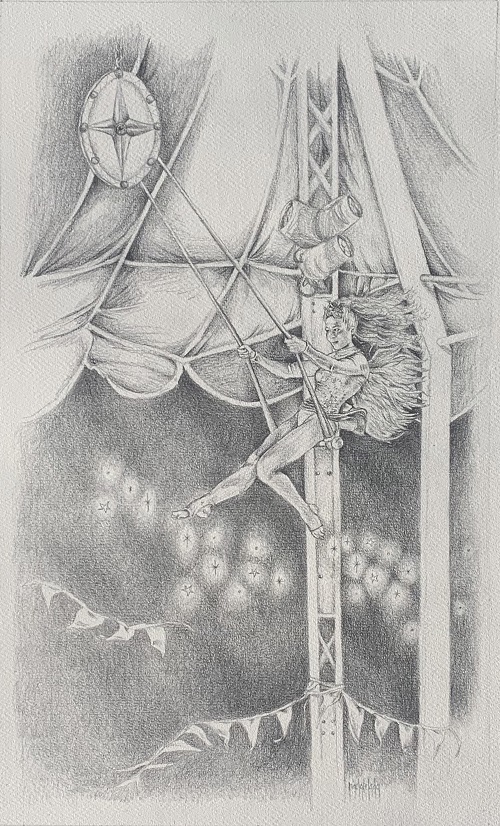 Las estrellas nos guían, faros celestes iluminan corazones. El enamorado busca consuelo, en la estrella vive el rostro de su amor. Manuel M. Ponce escribió Estrellita en 1912, y desde entonces brilla en la música mexicana. Paola Celada dibuja una trapecista, en las alturas del universo mítico del circo.