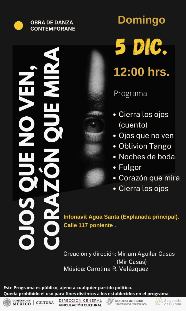 Como parte de una convocatoria de la Secretaría de Cultura del Estado de Puebla, que tuvo por objetivo invitar a la gente a realizar una pieza coreográfica para sensibilizar a la gente de cómo percibe el mundo una persona con discapacidad visual, Miriam Aguilar, resultó ganadora con su proyecto "Ojos que no ven, Corazón que mira", musicalizado por Carolina R. Velázquez.