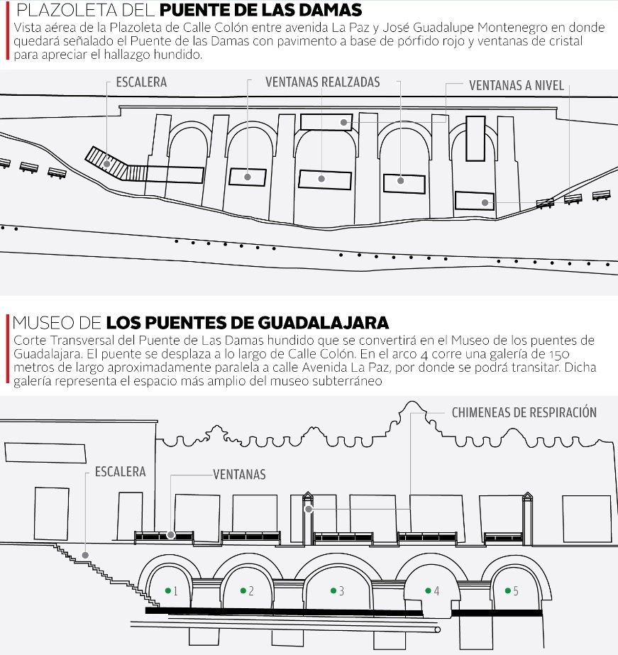 El arquitecto detalló que el lugar además de informar sobre la historia de los puentes y túneles en Guadalajara, exhibirá diversos objetos que se encontraron durante las excavaciones realizadas en la liberación del hallazgo, así como una maqueta del puente y una escultura de Rodo Padilla. El rescate ha durado cerca de cinco años