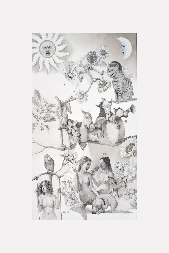 El dibujo contiene muchos elementos, con una técnica muy especial, Ramiro nos explica: “Cuando me puse a escuchar la pieza, pensando en una imagen, viendo las características de la pieza, pensé en algo muy nuestro y muy alegre. Lo primero que me vino a la mente fue el Árbol de la Vida. Estas piezas artesanales de barro, que hablan sobre escenas bíblicas. Hacen una combinación impresionante de personajes y cada artesano le pone su propia historia. Es una explosión de alegría; es una explosión visual, que correspondía con la atmósfera del Huapango. Particularmente árboles de Metepec. Me dio muchísima libertad, porque trabajé igual que los artesanos. Los artesanos trabajan las pequeñas piezas y las posicionan en esta estructura del árbol. Hice lo mismo, la técnica del dibujo es collage sobre papel, hecho con dibujos míos. Dibujos de mis libretas de hace mucho tiempo, que retrabajé, borré, redibujé; las recorté y las pegué sobre el dibujo. Eso me permite jugar mucho con los elementos, como si estuviera construyendo las cosas con barro”.