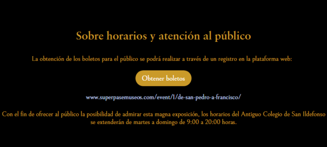 1.- Los horarios de atención al público de la exposición Vaticano: de San Pedro a Francisco, son de martes a domingo de 09:00 a 20:00 horas. El último miércoles de cada mes en el marco de noche de museos el horario es de 09:00 a 22:00 horas.
