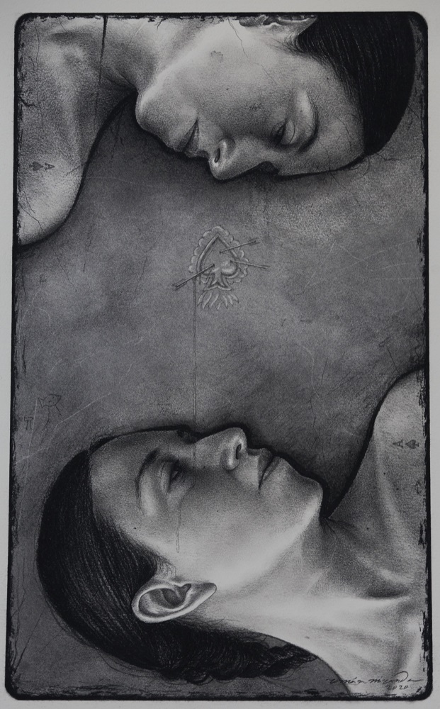 El amor es un juego de cartas, un póker en el que no sabes qué te va a tocar, un albur del todo o nada, y nos dice Román: “De hecho, mi dibujo se llama Retrato de un albur. Empecé a hilar pensamientos, simbolismos: la cantina, el juego de cartas, el amor y todo esto, nosotros lo atribuimos mucho al azar, a la suerte, a la buena o mala fortuna, por eso es un retrato doble. La composición es distinta: está tatuada con el as de picas. En esta simbología con la lectura de las cartas, todo el tiempo estamos buscando de dónde agarrarnos y de que nos lean el destino”.