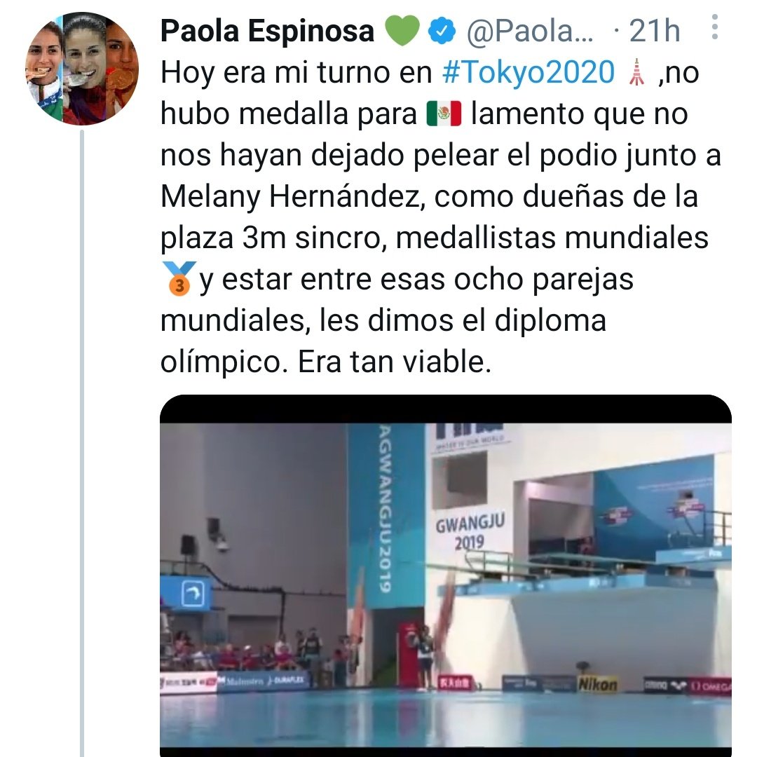 Luego de la competencia en trampolín de 3 metros para Dolores Hernández y Carolina Mendoza, Paola Espinosa reclamó en redes sociales dicho lugar que ella consiguió como plaza para México en el 2019 pero en el selectivo final quedó fuera.