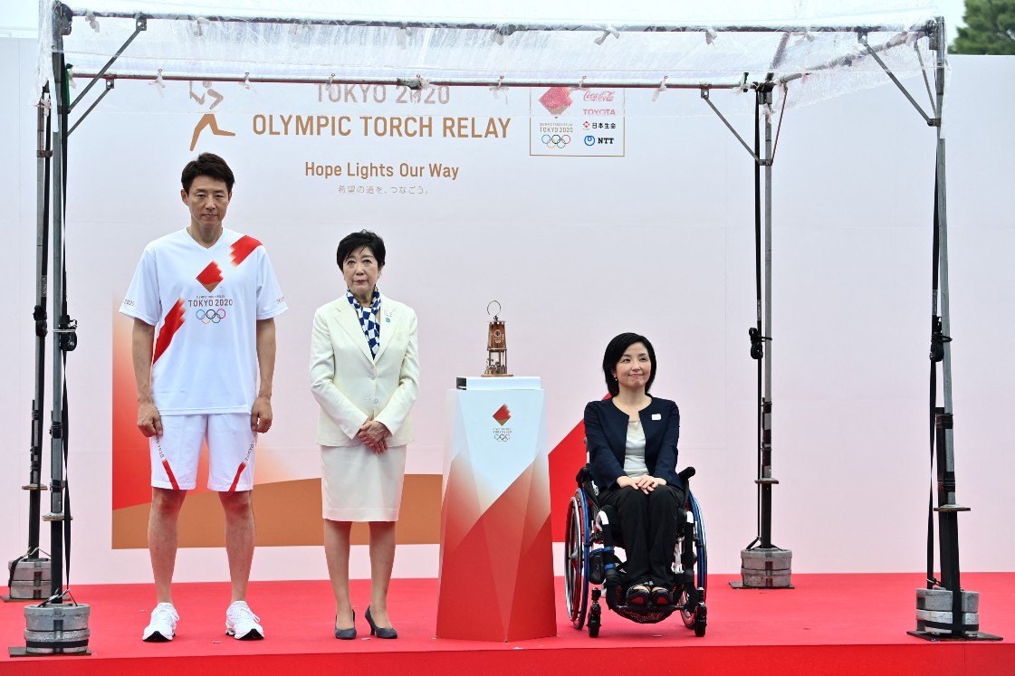 La gobernadora de Tokio, Yuriko Koike, estuvo entre los participantes de la ceremonia, retransmitida en directo en línea, junto a la tres veces tiradora paralímpica Aki Taguchi (una de los cinco embajadores de la antorcha) y el extenista Shuzo Matsuoka, primer relevista del tramo tokiota.