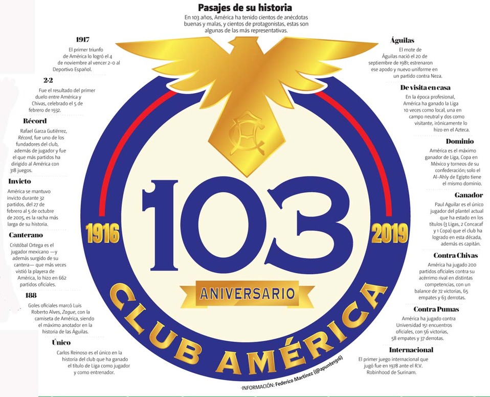 América celebra 103 años de historia, lo hace feliz, porque en los últimos 365 días se ha vuelto a situar como el club más ganador del futbol mexicano; ha llevado dos títulos a sus vitrinas y sigue alimentado esa estampa de equipo amado u odiado. Una institución a la que no le gustan las medias tintas; sin embargo, el festejo de este año no es tan pleno, porque aún escuece esa goleada que sufrió la semana pasada ante Cruz Azul.
