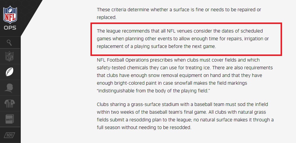 Y ahí mismo se ve que el plan del departamento de Operaciones de la NFL ocupa muchas áreas, incluyendo un llamado a los encargados de los estadios: “La liga le recomienda a todas las sedes considerar los días en que están programados los juegos cuando hagan sus planes al agendar otros eventos, para permitir que haya suficiente tiempo para hacer reparaciones, regar o reemplazar las partes del campo de juego que lo necesiten para estar listos para el siguiente juego”.