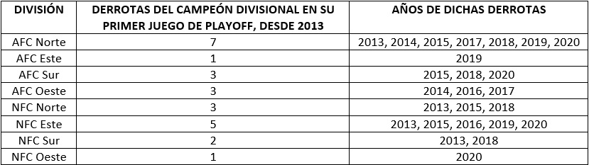 Si se compara la efectividad de los ganadores de las ocho divisiones de la NFL en su primer juego de postemporada, en el paso del 2013 al 2020, el campeón de la AFC Norte es el peor de toda la liga.