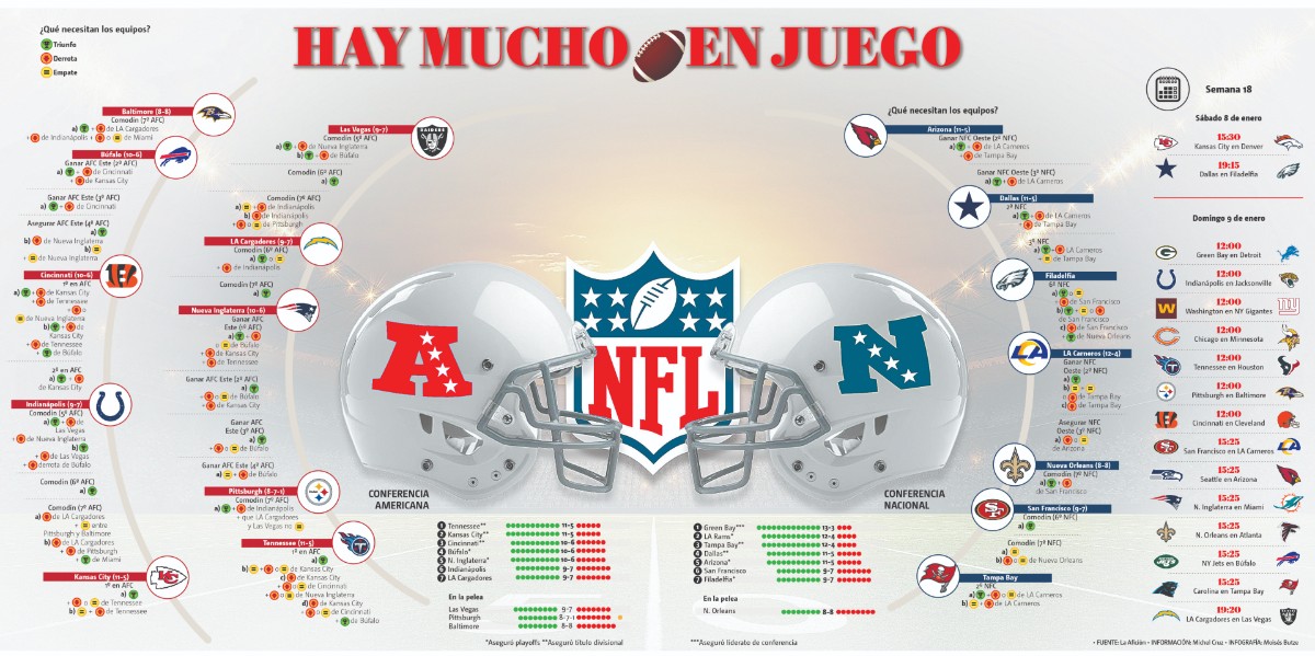 Ha llegado uno de los momentos más esperados por los aficionados de la NFL. Es la última semana de temporada regular y, con ello, la carta final de los equipos para conseguir un boleto como comodín, un título divisional o incluso luchar por la cima de la conferencia.