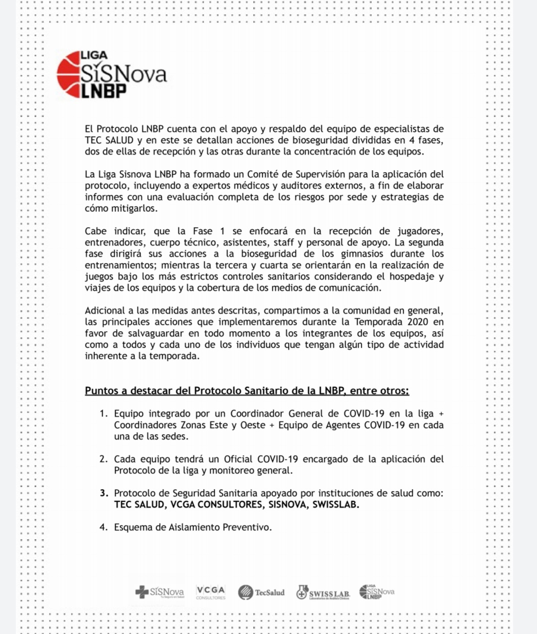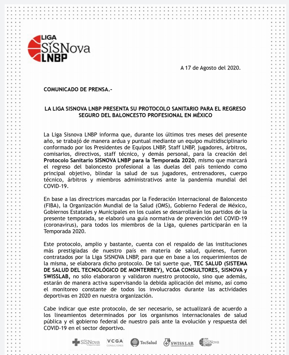 La Liga Nacional de Baloncesto Profesional (LNBP) dio a conocer su protocolo sanitario para la temporada 2020 ante la pandemia por el covid-19.