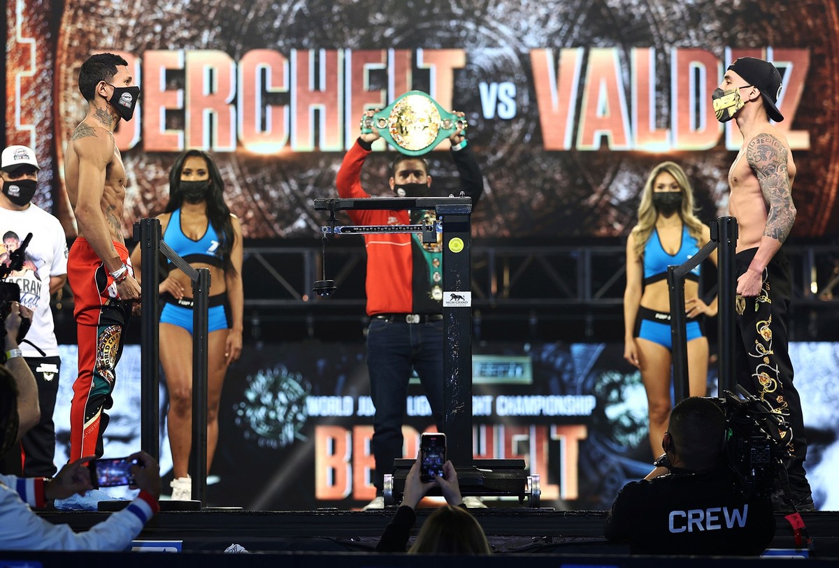 La incertidumbre previo a la ceremonia de pesaje en la burbuja de Las Vegas terminó cuando el campeón mundial yucateco Miguel Berchelt subió a la báscula para marcar 130 libras exactas, al tope de la división, y así dar paso al duelo que sostendrá mañana ante el retador sonorense Oscar Valdez.