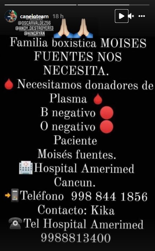 “Familia boxística, Moisés Fuentes nos necesita. Necesitamos donadores de plasma, B negativo, O negativo”, informó el Canelo Team en Instagram, misma en la que compartió que el boxeador se encuentra en el Hospital Amerimed Cancún.