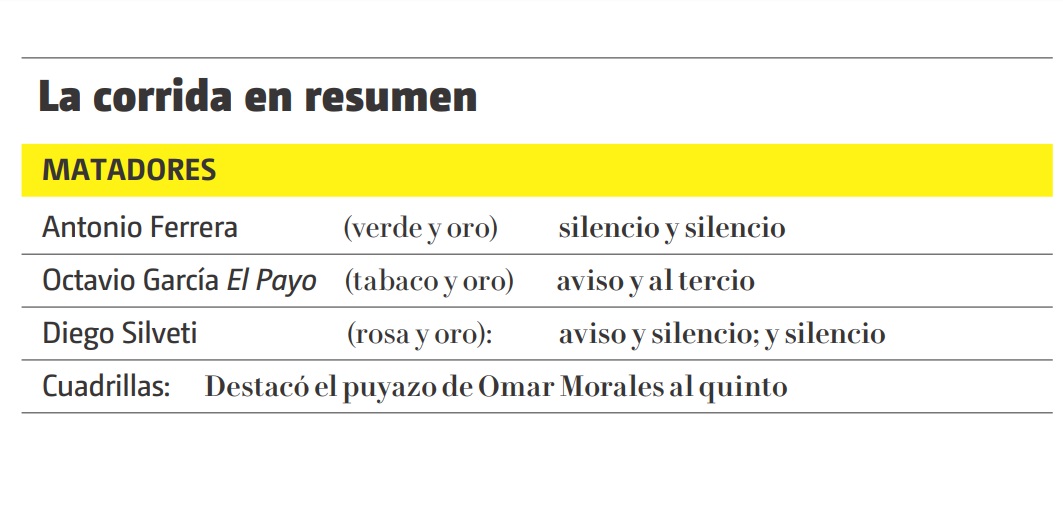 El tercer espada Diego Silveti, poco pudo hacer, primero ante un toro que le probaba en cada embestida y luego con otro astado que tampoco mostraba ningún interés por acometer.