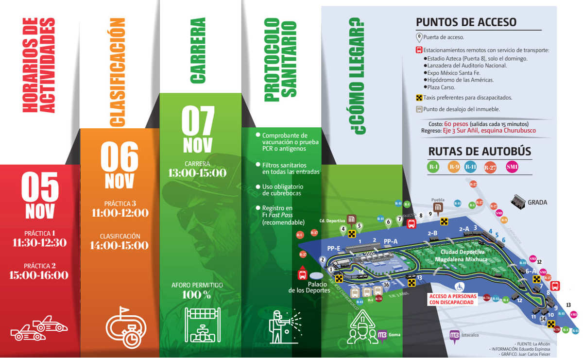 Todo está listo: los motores se encenderán y rugirán en el Autódromo Hermanos Rodríguez con el inicio del Gran Premio de la Ciudad de México. Hoy están programadas las dos primeras prácticas libres, mañana se realizará la tercera sesión de entrenamientos y la clasificación, mientras que la carrera se disputará a las 13 horas del domingo.