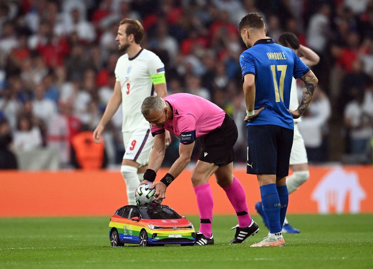 En los momentos previos al arranque del Italia vs Inglaterra, la final de la Eurocopa 2021, el balón utilizado para la patada inicial llegó al árbitro central en un mini carrito pintado con los colores de la comunidad LGBT.