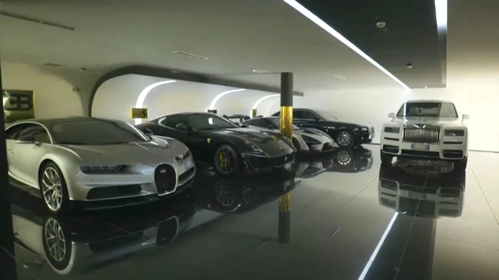 Algunos de los vehículos que se pueden ver son un Buggati Chiron en color plata, un Ferrari negro, un icónico McLaren Senna, una camioneta Rolls Royce blanca además de un Mercedes-Benz S65 AMG y un Bugatti Veyron, entre otros.