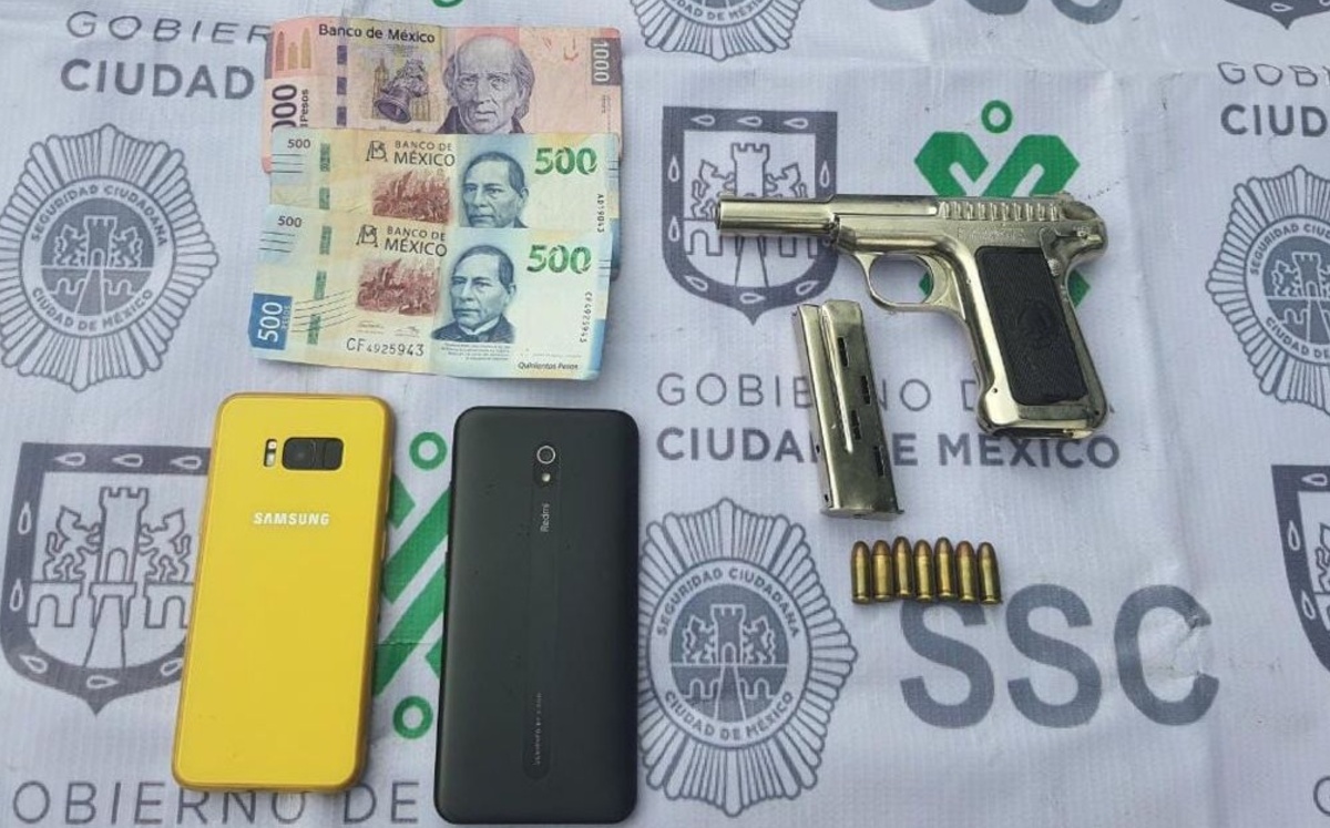 De manera inmediata, los elementos de seguridad les dieron alcance sobre la calle Esterlinas, donde se les indicó que descendieran del vehículo para posteriormente realizarles una revisión preventiva, lo que derivó en el aseguramiento de una pistola con siete cartuchos útiles, dinero y dos teléfonos celulares.