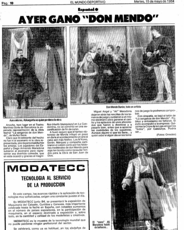 Fue en la temporada 1983-84 cuando el capitán del RCD Espanyol, Fernando Molinos, propuso a sus compañeros de equipo realizar una obra benéfica en pro a los niños del Hospital Sant Joan de Déu. Aceptada la iniciativa por la directiva perica, se decidió representar la comedia escrita a principios del siglo XX por Pedro Muñoz Seca, ‘La Venganza de Don Mendo’. La plantilla blanquiazul estaba lista, Thomas N’Kono, Mauri, Orejuela, Zúñiga, Tintín Márquez y hasta el mismo técnico Xabier Azkargorta tenía un papel en la puesta en escena, pero los pericos querían más, así que invitaron a la estrella del Barcelona, que sin dudarlo aceptó.