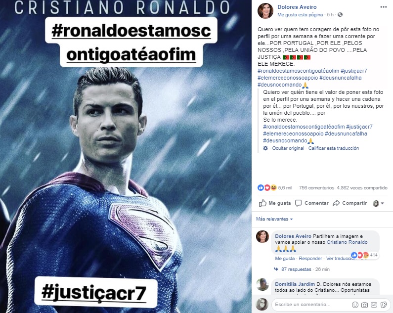 "Quiero ver quién tiene el valor de poner esta foto en su perfil durante una semana y hacer una corriente por él", escribió Aveiro, junto a una fotografía de Ronaldo vestido con el traje de Superman en la que se puede leer el mensaje "#ronaldoestamoscontigoatéaofim" ("Ronaldo estamos contigo hasta el final").