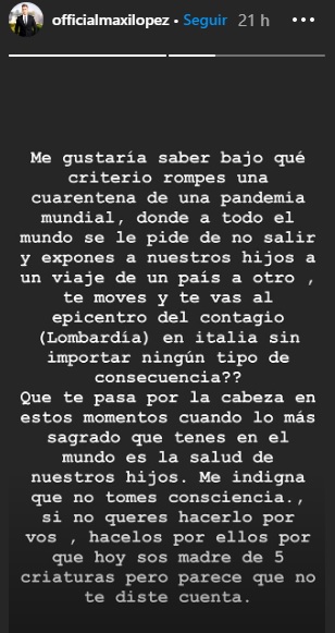 “Me gustaría saber bajo qué criterio rompes una cuarentena de una pandemia mundial, donde a todo el mundo se le pide no salir de su casa, y exponer a nuestros hijos a un viaje de un país a otro, te mueves y te vas al epicentro del contagio en Italia, sin importarte ningún tipo de consecuencia”, comentó Maxi López en Instagram.