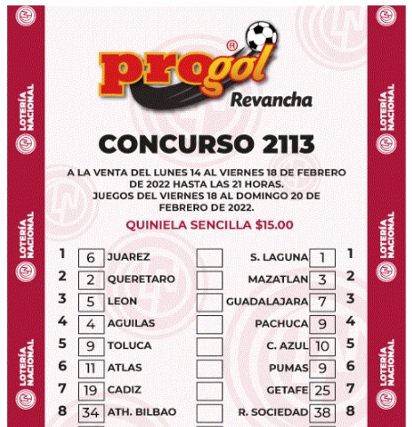 El boleto de la quiniel Progol número 2113 salió a partir del lunes 14 y estará disponible hasta el viernes 18 de febrero a las 21:00 horas, en el que se incluirán los partidos nacionales e internacional del viernes 14 al domingo 20 de febrero.