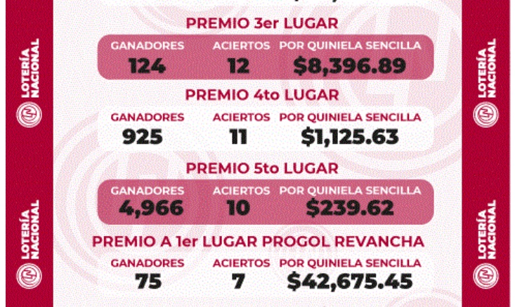 El tercer lugar tuvo 124 ganadores, quienes acertaron en 12 partidos, por lo que ganarán 8 mil 396.89 pesos. En la cuarta posición hay 925 ganadores con 11 aciertos, quienes se llevarán mil 125.63 pesos.