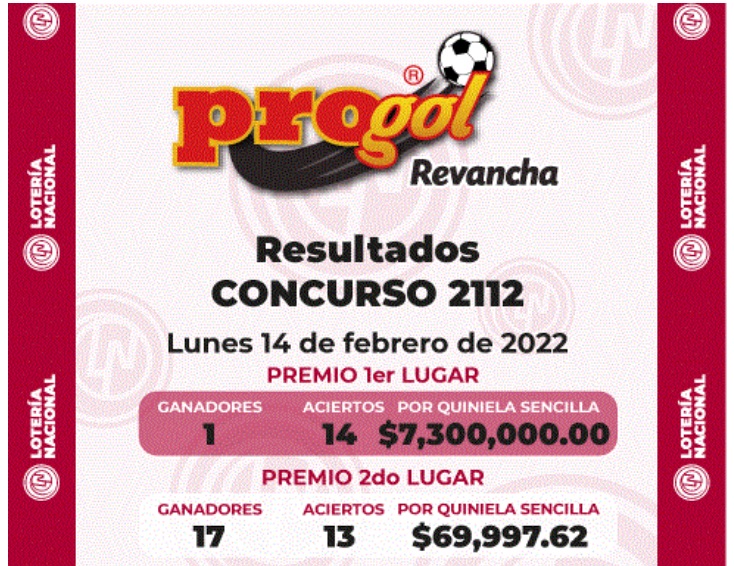 La Lotería Nacional dio a conocer los resultados de la quiniela Progol número 2112 del lunes 14 de febrero, en el cual hubo un solo ganador con 14 aciertos, quien se llevó más de siete millones de pesos.
