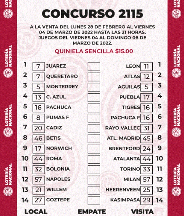 El boleto de la quiniela Progol número 2115 salió a partir del lunes 28 y estará disponible hasta el viernes 04 de marzo a las 21:00 horas.