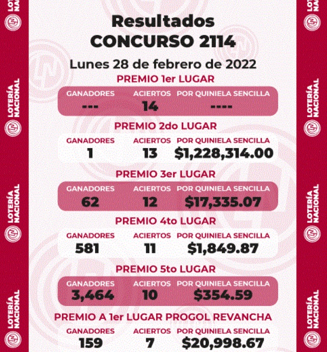 La Lotería Nacional dio a conocer los resultados de la quiniela Progol número 2114 del lunes 28 de febrero, en la cual no hubo ganadores con 14 aciertos, por lo que el premio se vuelve a acumular para la próxima semana.