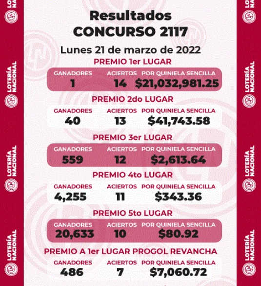 La Lotería Nacional dio a conocer los resultados de la quiniela Progol número 2117 del lunes 21 de marzo, en el cual hubo un solo ganador con 14 aciertos, quien se llevó más de 21 millones de pesos.