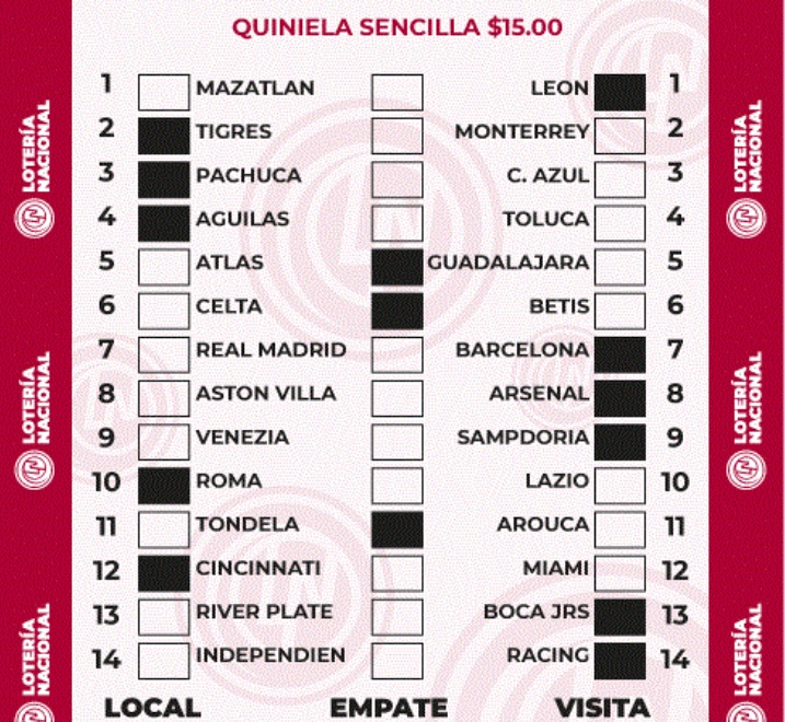 El boleto de la quiniela sencilla cuesta 15 pesos, la cual incluye un total de 14 partidos, mientras que si quieres jugar la revancha pagarán 5 pesos extra.