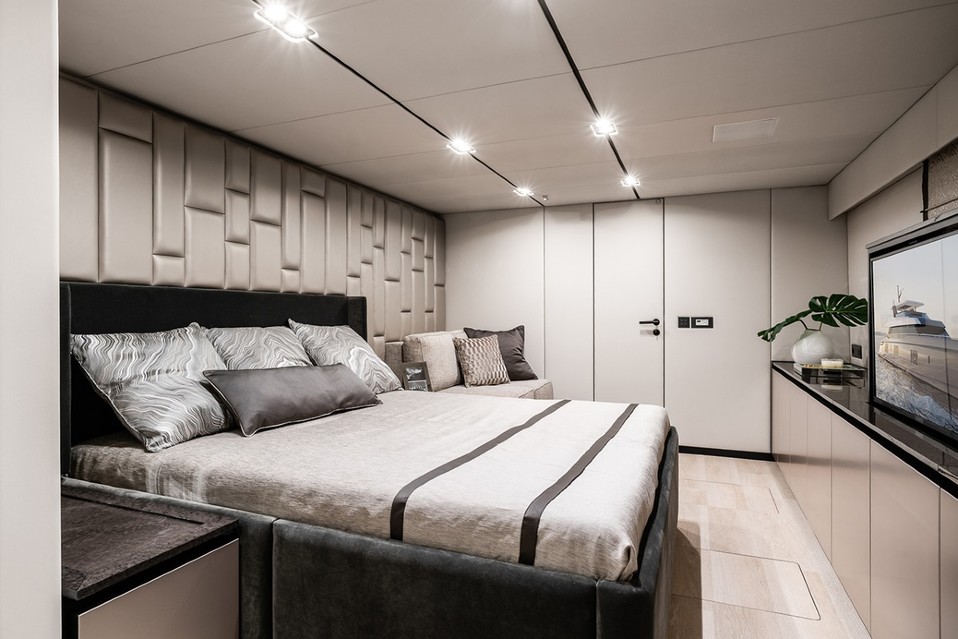 Una de las características del yate que más destaca es la suite principal, que incorpora una cama doble que da a la terraza de proa, un baño con ducha a ras de suelo, vestidor y escritorio. También dispone de una lancha auxiliar y motos de agua.